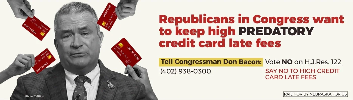 OMAHA, Nebraska (May 15, 2024)—Nebraska For Us is taking its latest message to one of the highest traffic areas in Omaha to call on Congressman Don Bacon to oppose H.J.Res.122—a resolution that would keep predatory credit card late fees high at a time when the Consumer Financial Protection Bureau (CFPB) has moved to lower them to $8, cutting predatory fees and saving hardworking families money.